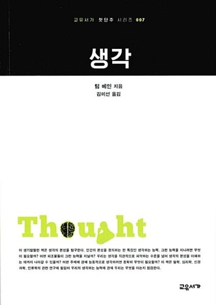 <교유서가 첫단추> 시리즈 제7권. 영국 옥스퍼드대 출판부에서 펴내는 <Very Short Introduction> 시리즈의 생각 편을 옮긴 것이다. 저자 팀 베인은 인간의 본성을 정의하는 한 특징인 생각하는 능력을 지니기 위해서는 무엇이 필요하고, 어떤 피조물들이 그런 능력을 지니는지, 우리는 생각을 직관적으로 파악하는 수준을 넘어 생각의 본성을 이해하는 데까지 나아갈 수 있는지 등 생각의 본성을 탐구한다. 철학, 심리학, 신경과학, 인류학의 관련 연구에 힘입어 우리의 생각하는 능력에 관해 우리는 무엇을 아는지 살핀다.